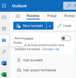 Putem stranice Osobe na servisu Outlook.com možete prikazati, stvarati i uređivati kontakte i popise kontakata. Stvorite nove kontakte ispočetka ili dodajte nekoga kao kontakt iz poruke e-pošte. Možete stvoriti i popis kontakata za slanje e-pošte grupi osoba.